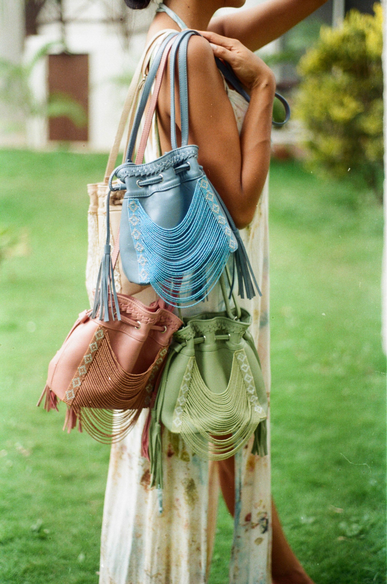 Strings of beading, hang down from this leather bag, swinging as you wear it. Each piece is beaded by hand and woven onto leather by Mexican artisans. The drawstring closure is finished with two leather tassels hanging on either side. A braided leather weaving adorns the top edge of the bag. The crossbody strap is adjustable and the bag includes an inside flap pocket.