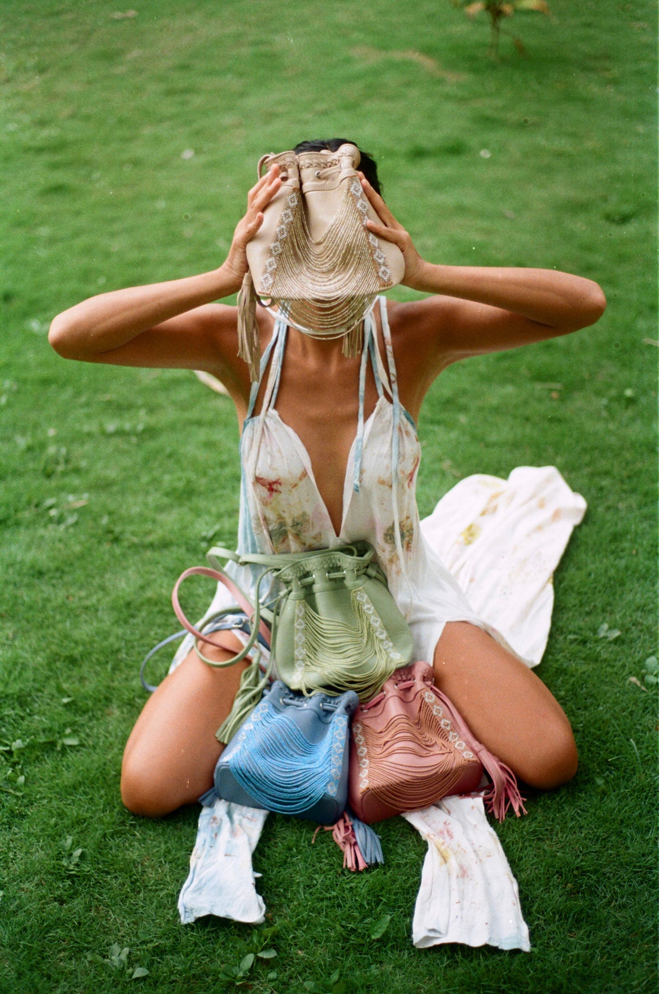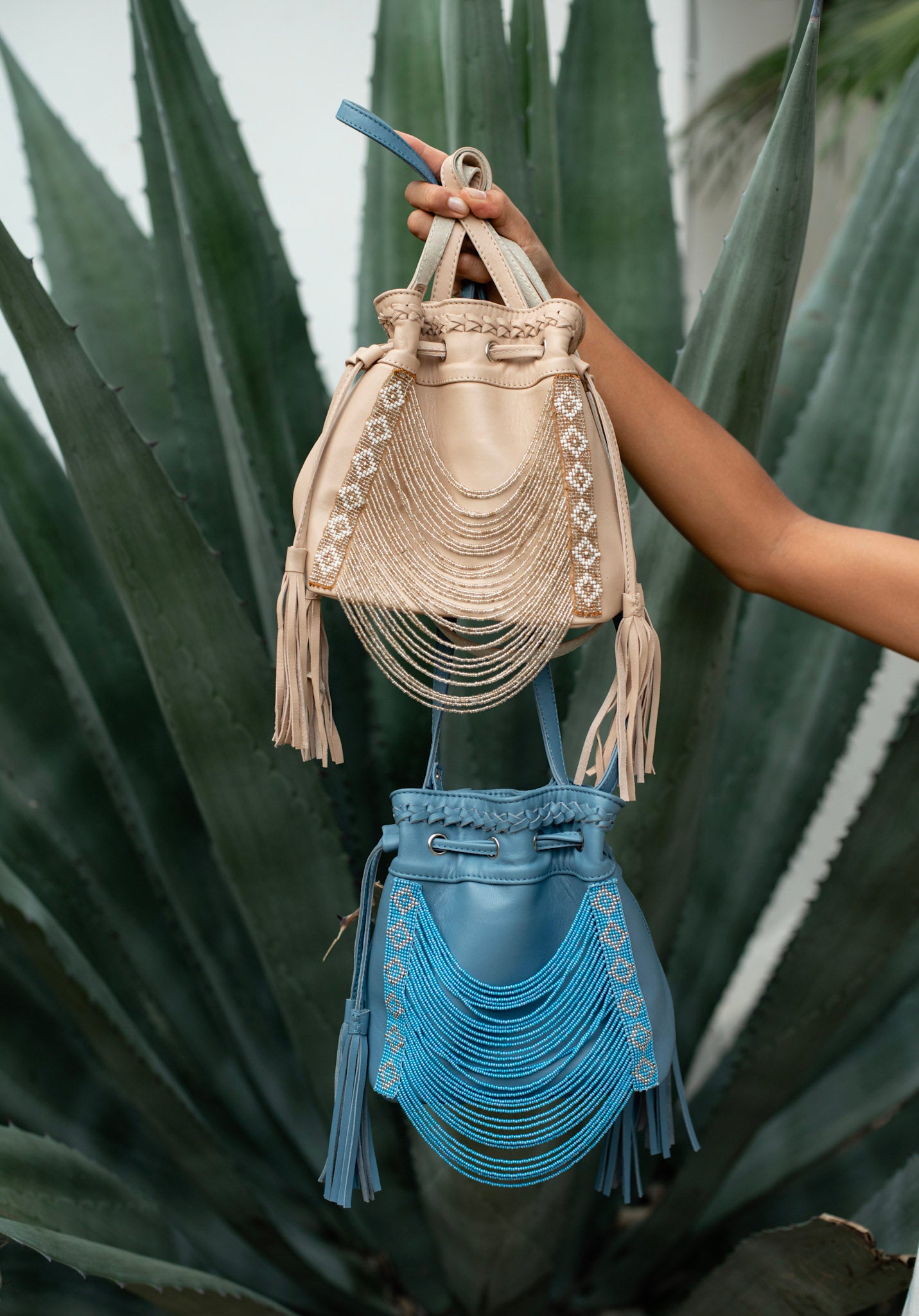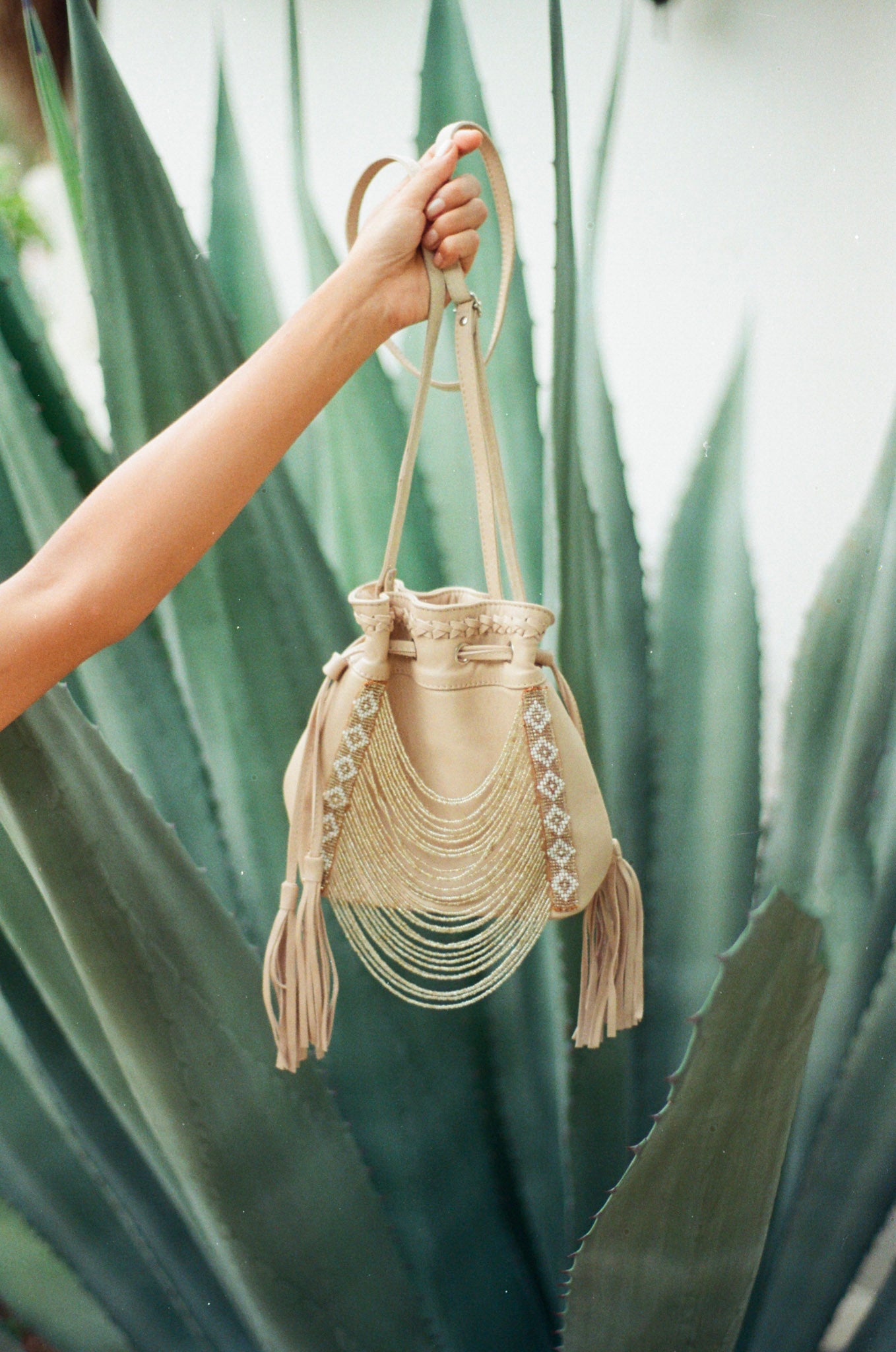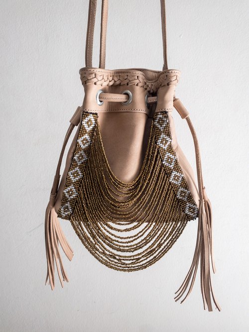 Strings of beading, hang down from this leather bag, swinging as you wear it. Each piece is beaded by hand and woven onto leather by Mexican artisans. The drawstring closure is finished with two leather tassels hanging on either side. A braided leather weaving adorns the top edge of the bag. The crossbody strap is adjustable and the bag includes an inside flap pocket.